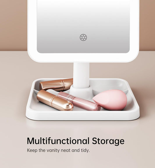 FUNTOUCH Vanity Mirror with Lights, Rechargeable 10X Magnification 3 Color Lighting Portable Tabletop Cosmetic Make Up Mirror, 360° Rotation Led Light up Mirrors with Storage